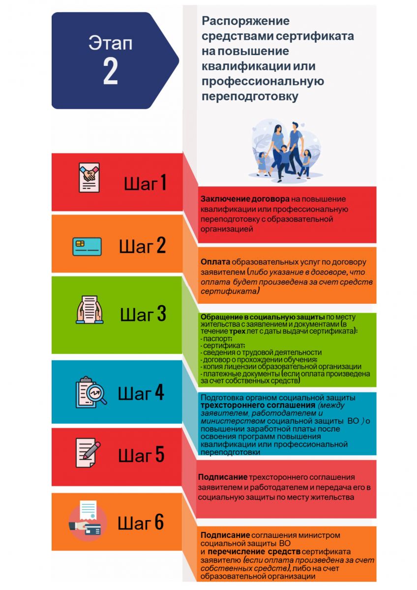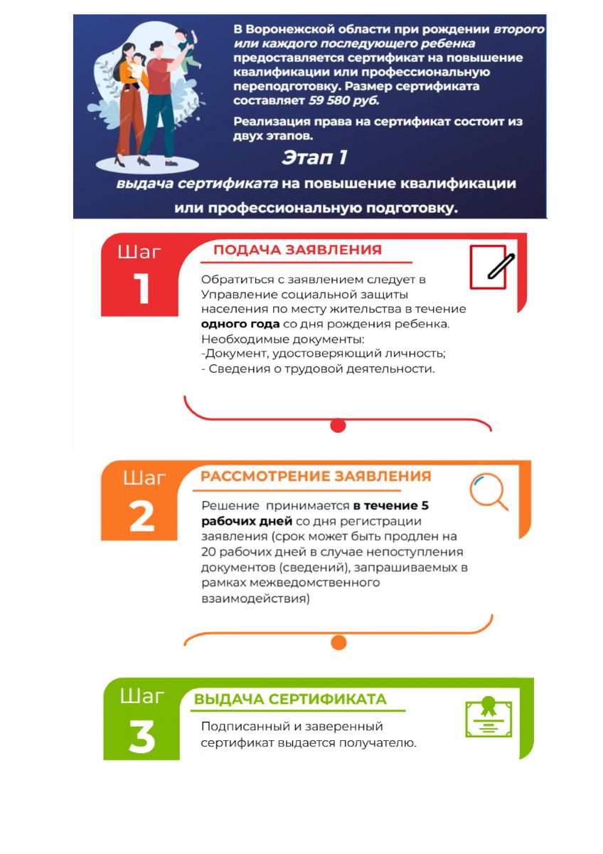 Законом Воронежской области от 28.11.2008 №103-ОЗ «О социальной поддержке отдельных категорий граждан в Воронежской области» установлена дополнительная мера социальной поддержки в связи с рождением второго или каждого последующего ребенка в виде сертификата на повышение квалификации или профессиональную переподготовку одного из родителей, состоящего в трудовых отношениях с работодателем на момент рождения второго или каждого последующего ребенка.